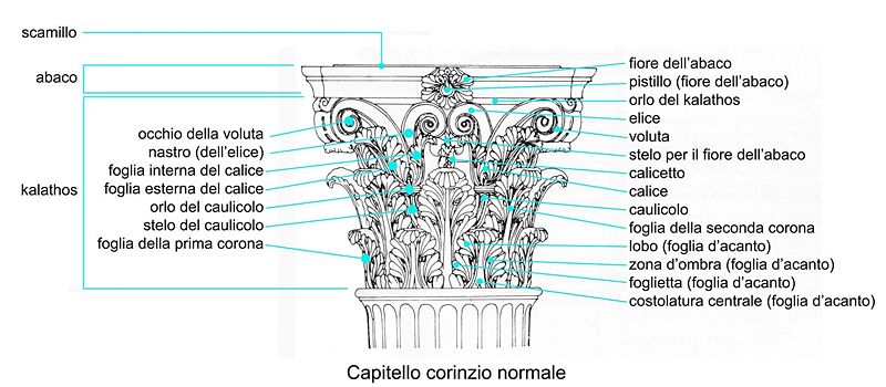 Nomenclatura degli elementi costitutivi di un capitello corinzio.