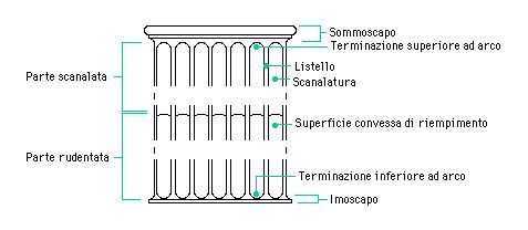 Schema di un fusto rudentato, con nomenclatura delle parti costitutive.